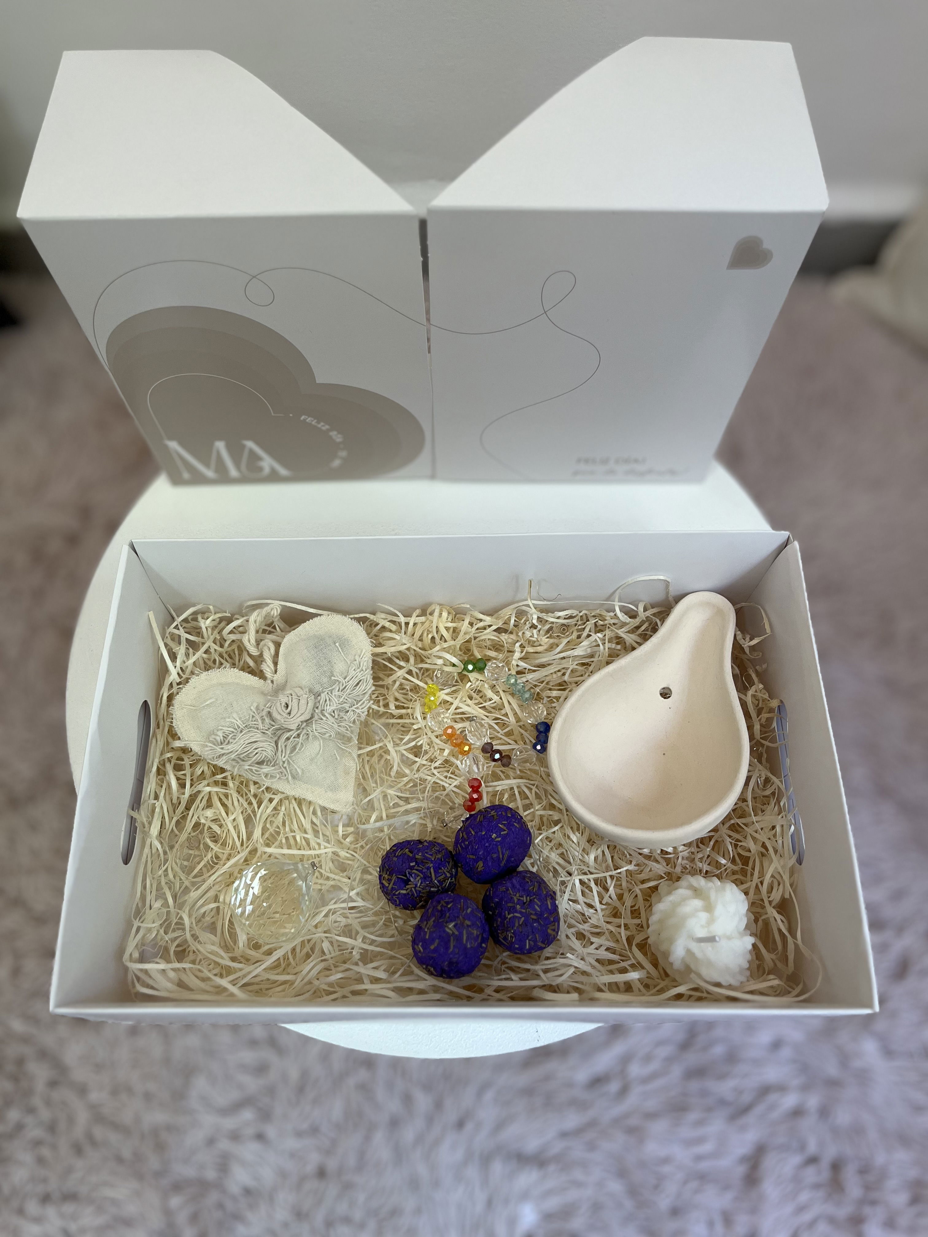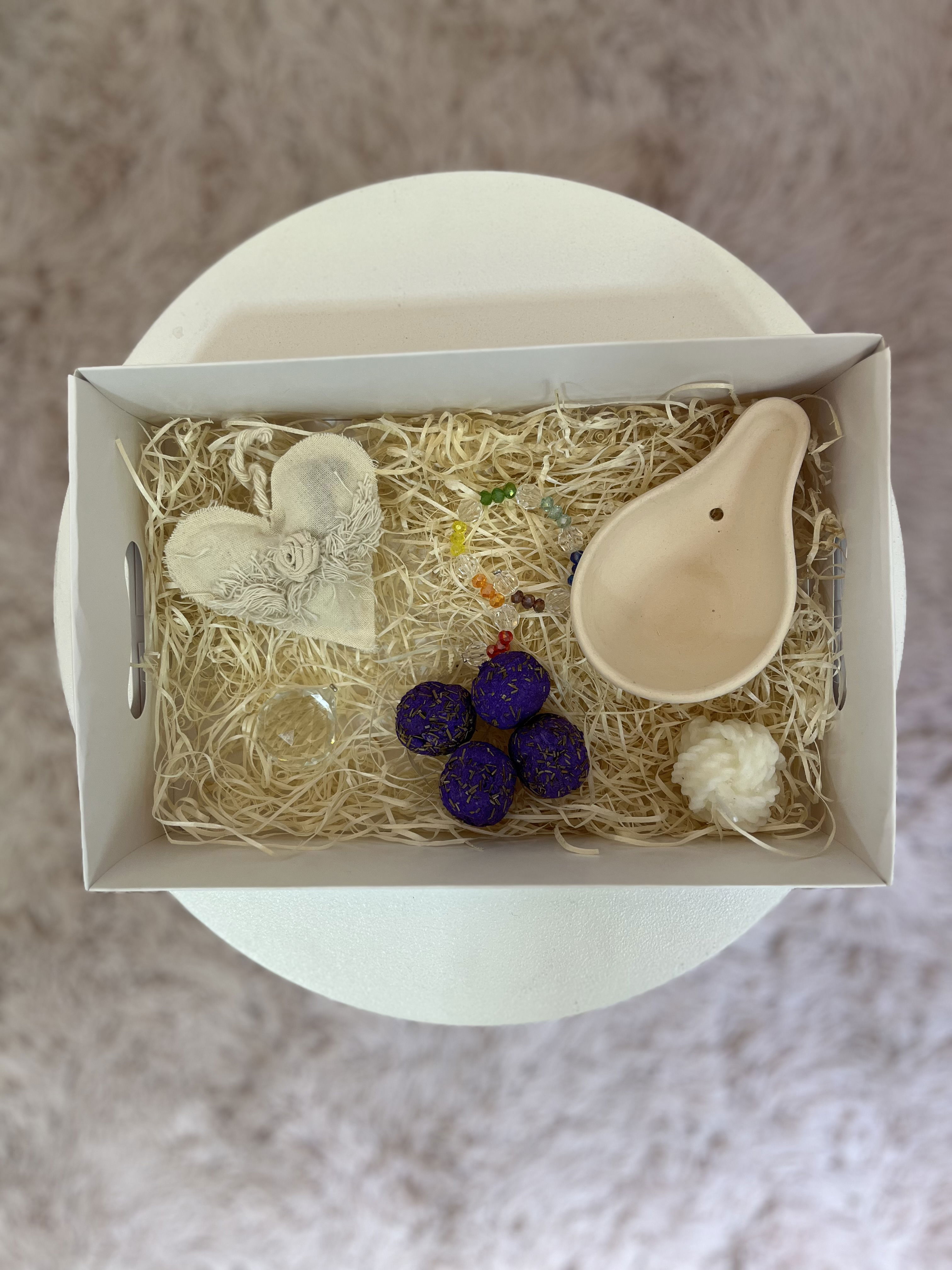 Contiene: Sahumador + bombitas defumacion activada + atrapasol vidrio grande + corazón terapéutico + vela nudo aromática